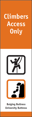 I think (perhaps with some irony) that a "climbers access only" sign makes them exclusive which i don't think is fair. A far more inclusive and progressive way to limit traffic is simply to ensure the tracks are discreet and unsigned/posted. Its also cheaper that way and doesn't clutter the landscape with 'low key' signage.